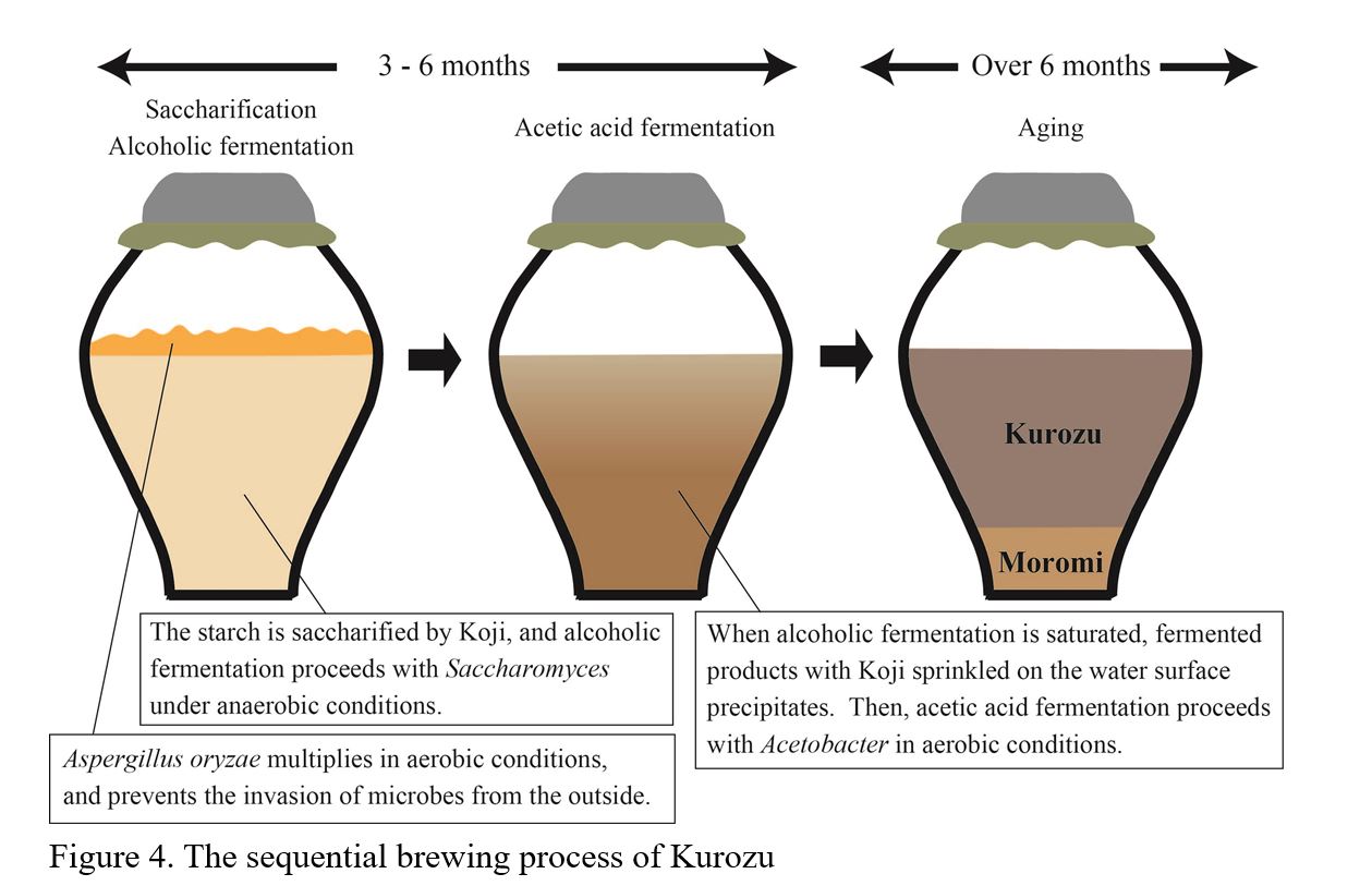 Brewed rice vinegar, Kurozu, is a traditional Japanese vinegar with a dark amber color. Kurozu is produced in a regional area of Japan using traditional techniques and made inside handcrafted pottery jars. Kurozu is used as both a seasoning and a healthcare supplement. In vitro and in vivo investigations of ingredients in Kurozu have been carried out. Studies of the functional aspects of Kurozu began in the 1980s, and the health promoting and disease preventing effects of Kurozu have since been elucidated. It was reported that Kurozu improved the symptoms of hypertension, allergies, hypercholesterolemia, enhanced carbohydrate metabolism, and inhibited tumor growth. Kurozu-Moromi is an insoluble product created from the fermentation of Kurozu. Kurozu-Moromi also shows valuable properties, including improvement in dyslipidemia, prevention of hyperglycemia, antitumor effect, and antiallergic activity.