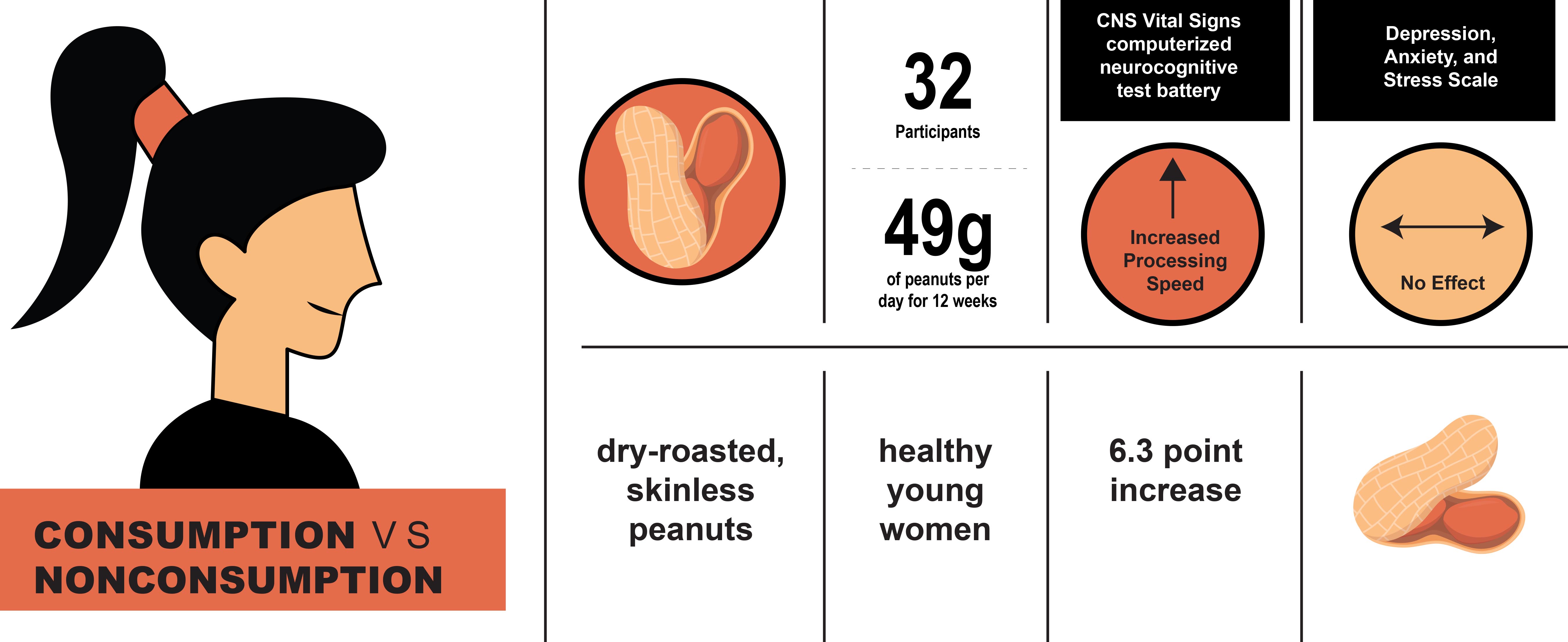Results:There was a significant difference between the two groups in reaction time (6.9 points; p = 0.029), with the control group having a greater increase in scores. There was a significant within-group effect of peanuts on processing speed, with the peanut group increasing scores by 6.3 points (95% CI: 2.7, 9.8). There was no effect of peanut consumption on depression, anxiety, or stress scores.