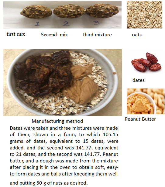 Background: Dates are recognized as a rich source of nutrients, so they are considered a complementary food element positioning them as functional food for athletes. Energy balls are nutritious snack foods that people, individuals and athletes enjoy. They are a source of natural sugars, fibers and proteins that are nutritionally balanced. Food supplements consist of protein, fats, vitamins, minerals and carbohydrates.