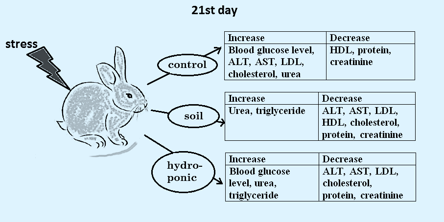 Materials and Methods: The study was done with the usage of a rabbit model, using water extract of Moringa leaves made with a 150 mg count of leaves on 1 kg weight of the animal. Hyperglycemia in the rabbits was induced by 21-day immobilization stress (3 hours a day). Rabbits were divided into 4 groups: the first  group was treated with the extract from the hydroponic Moringa in a dose of 2 ml/day, the second group received the extract from the soil Moringain a dose of 2 ml/day, the third group was the control—which did not receive any extract, but was exposed to stress, like first  and second  groups— and the fourth  group was the norm, which did not receive any extract and was stress free. Each group included 3 animals as means of replication. The glycogen level was measured in the livers, hearts, and muscles of rabbits. The level of glucose, total cholesterol, HDL, and LDL were measured in the serum of animals.