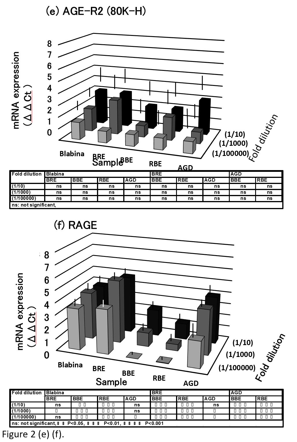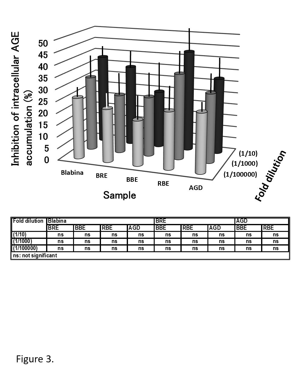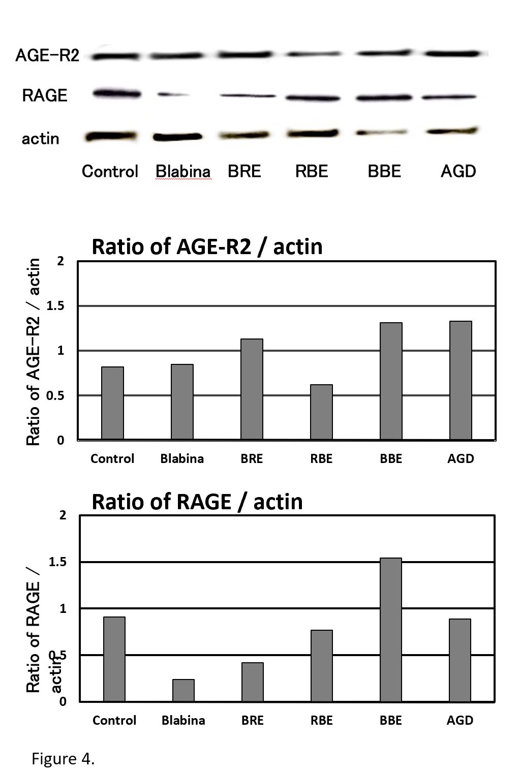 Results: Although concentration-dependent effects of berry extracts tested on mRNA levels of AGE receptors in HUVECs were not clear, mRNA level of the AGE receptor RAGE that is involved in the intracellular ROS production was increased by Blabina, which contains BRE, and the well-known anti-glycation compound aminoguanidine (AGD). In contrast, the protein expression level of RAGE was decreased by BRE and Blabina, but not by AGD. It was also found that BRE and Blabina suppressed AGE-BSA-stimulated ROS production in HUVECs. The extent of inhibition in the RAGE protein expression by BRE and Blabina was correlated well with the ROS generation measured in these samples.